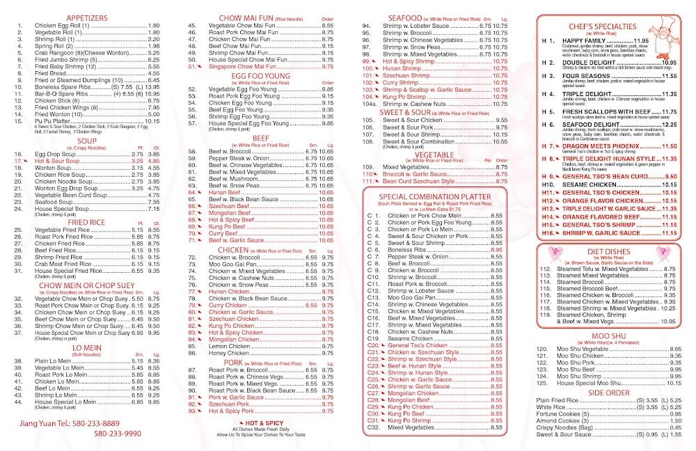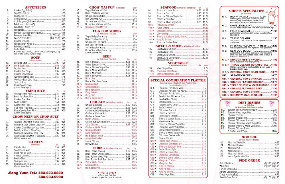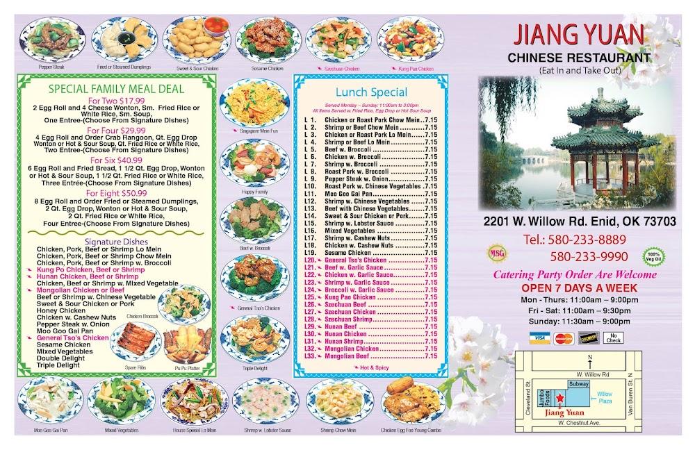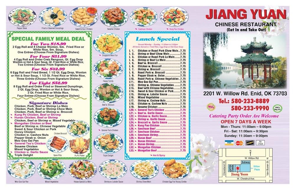 Welcome to Jiang Yuan, your go-to Chinese restaurant in Enid, OK, where flavor meets tradition. We specialize in offering delicious dine-in and takeout options, perfect for lunch or a relaxed dinner. Our menu features a variety of vegetarian-friendly dishes and smaller portions ideal for sharing, all crafted with fresh, wholesome ingredients. Enjoy our cozy atmosphere, accessible seating, and an environment that welcomes students and families alike. With convenient payment options and reservations available, we strive to make your dining experience seamless. Visit us today at 2201 W Willow Rd, but please note: we do not deliver.